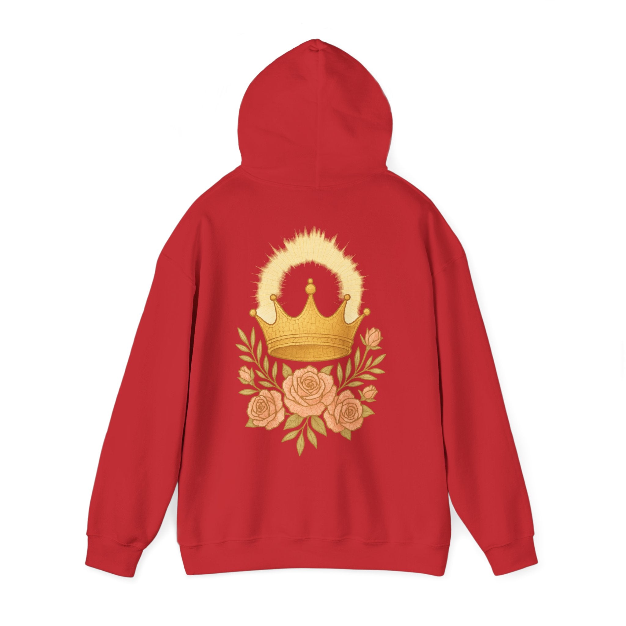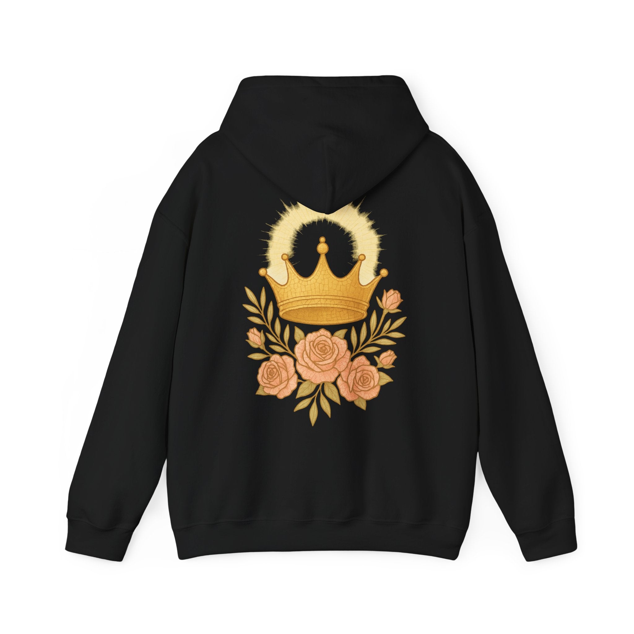 Stay cozy and stylish with this unisex heavy blend hooded sweatshirt. Perfect for chilly days, it features a soft fabric blend that offers warmth while keeping you comfortable all day long. The beautiful back design with a crown and roses adds a touch of elegance, making it not just an ordinary sweatshirt but a statement piece. Ideal for casual outings, lounging at home, or gifting to loved ones during holidays and celebrations. Perfect for anyone who loves to combine comfort with style throughout the year.